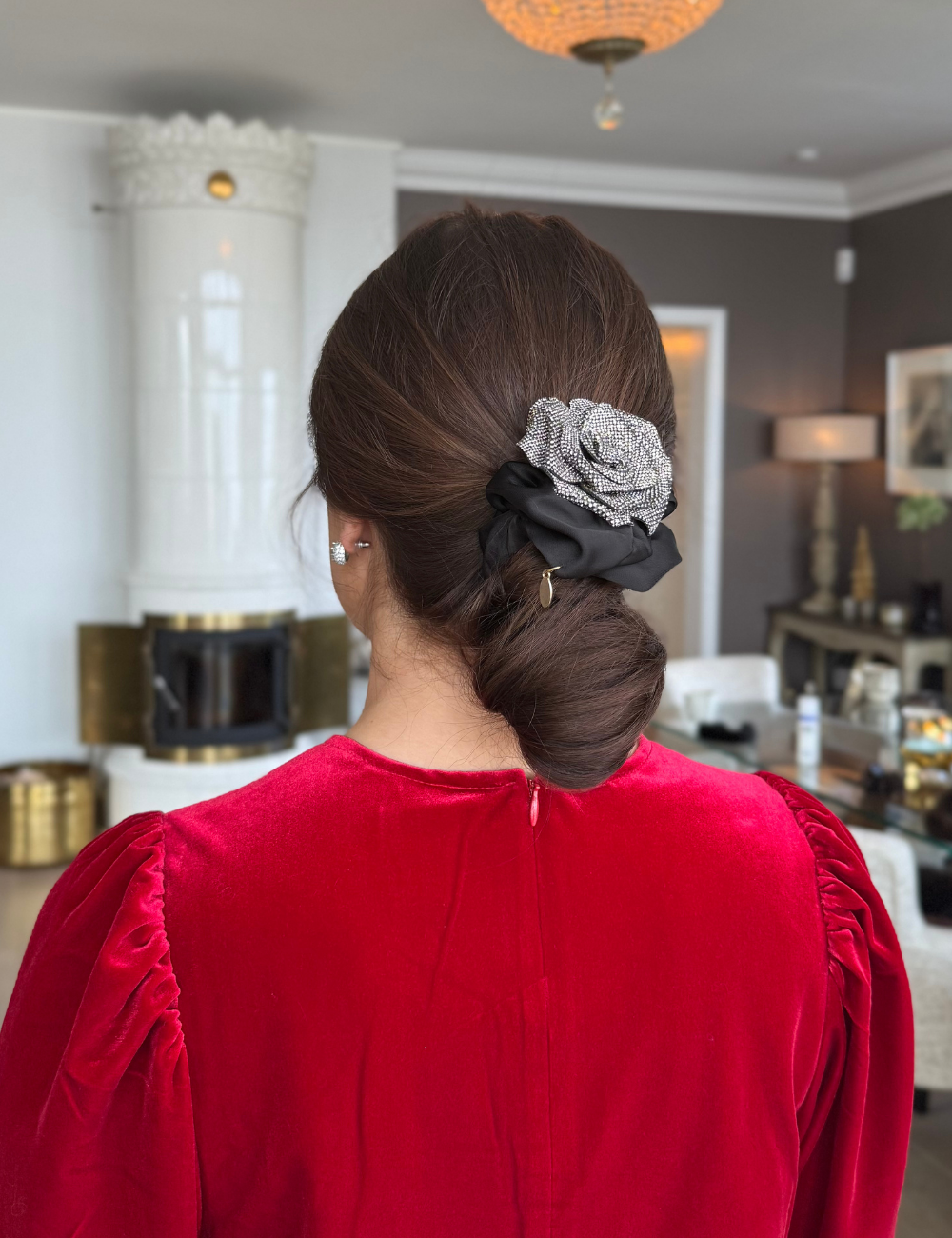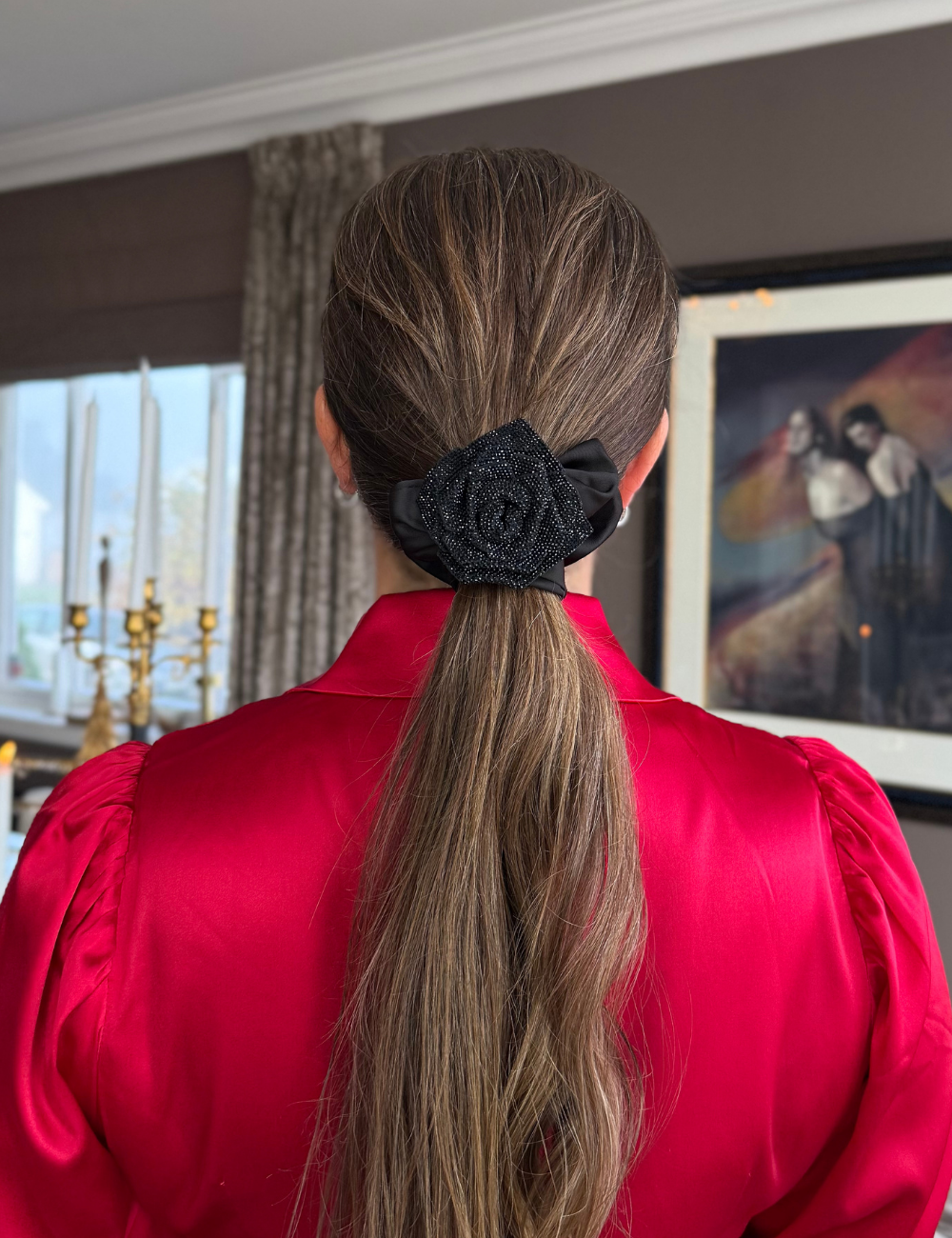 Noma`s lekre hårstrikker i sort silke look med fin strass blomst. Nydelig i håret.Finnes i flere farger.