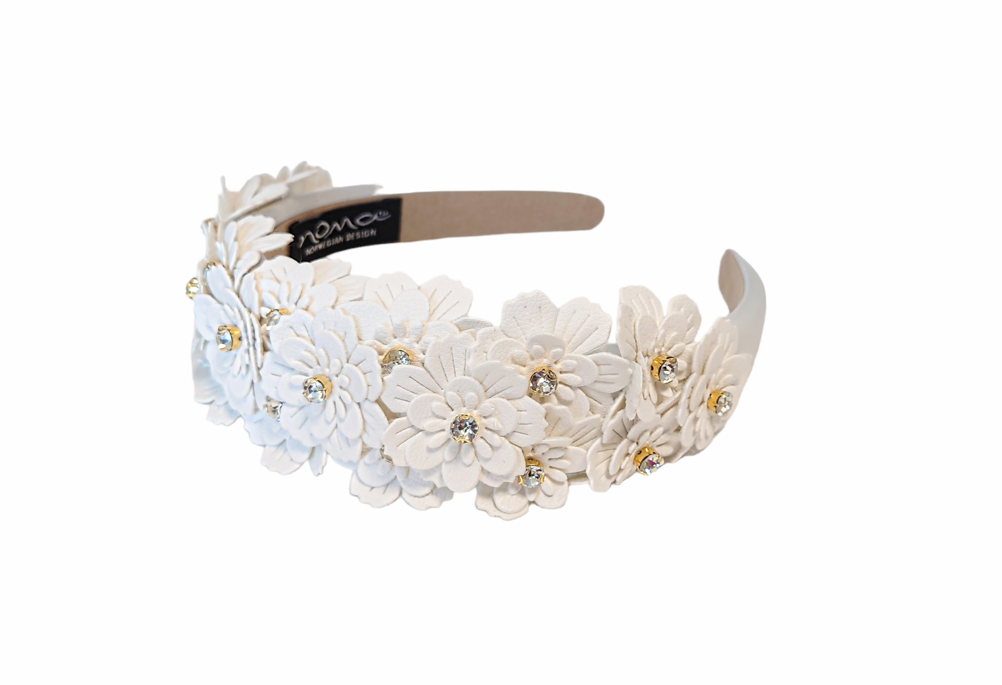 Lekre hårbøyler i silkelook, med nydelige håndsydde blomster i leather look og stener.