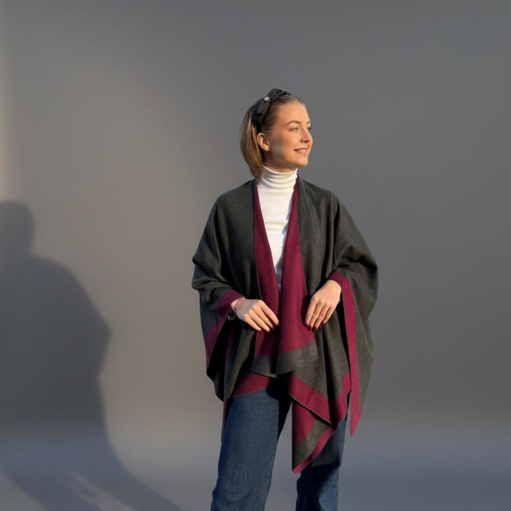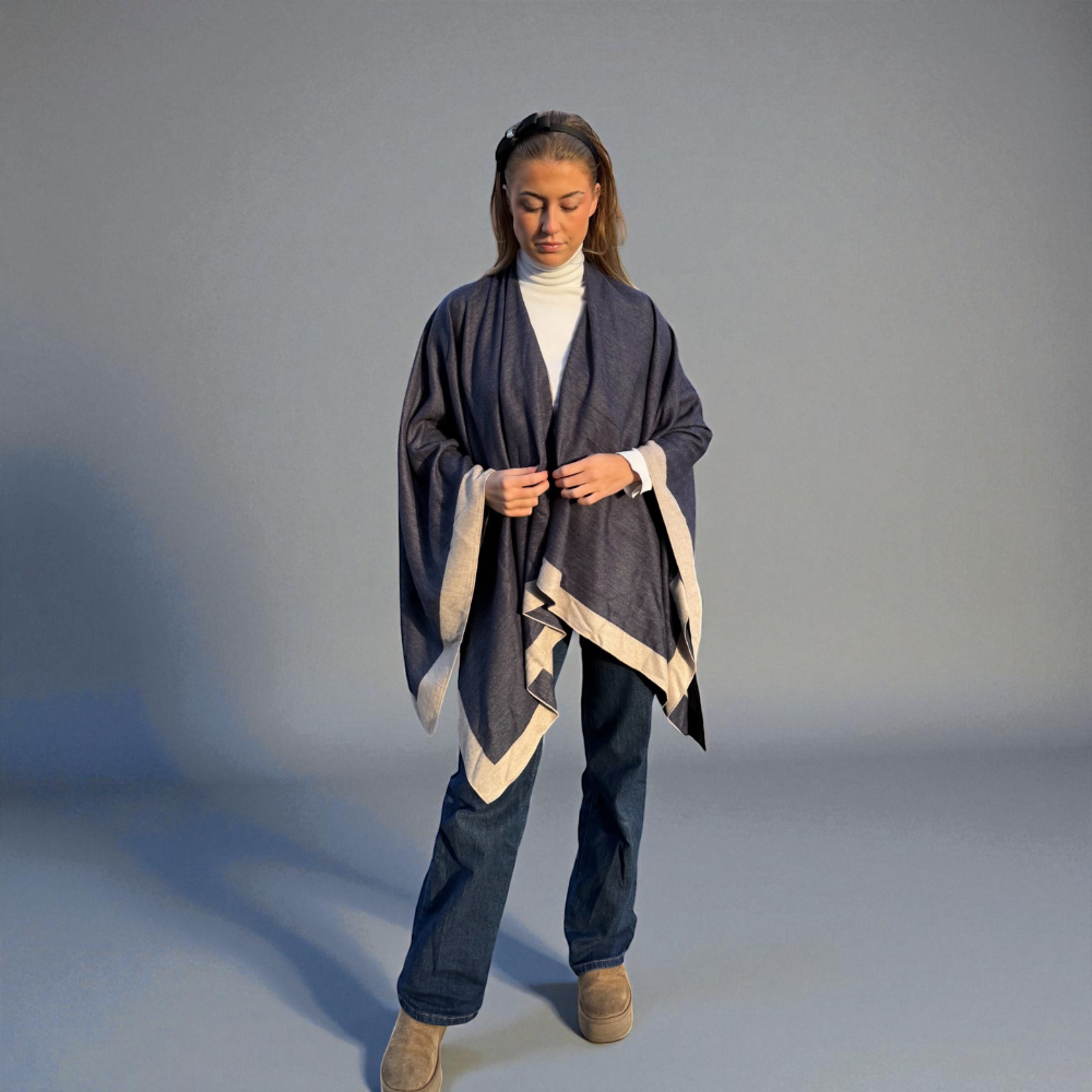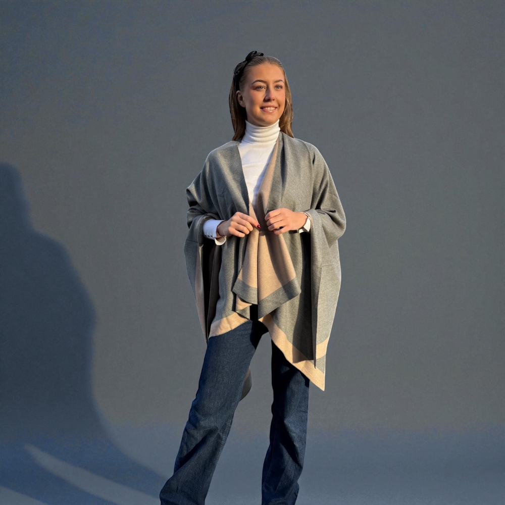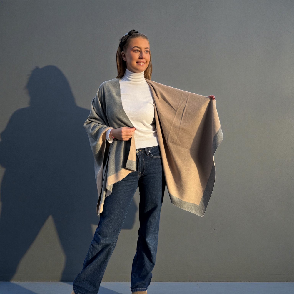 Denne ponchoen er superfin og kan brukes på begge sider! Tofarget poncho med kant slik at du får to i en.
